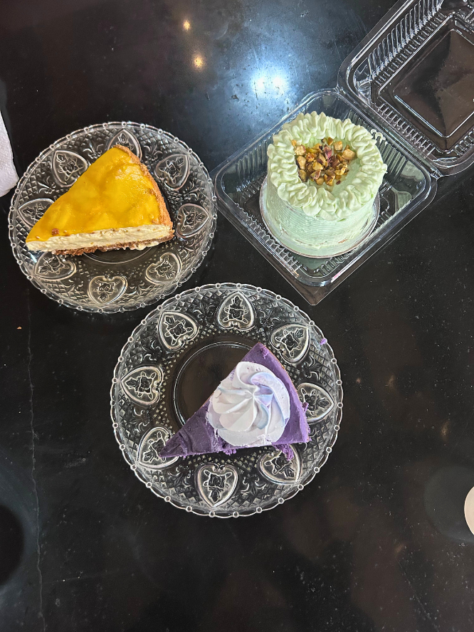 デザートには色鮮やかなケーキを注文。紫いも(ウベ)のケーキやピスタチオのケーキなど、日本ではあまり見ない色合いが印象的でした。とても甘く、十分に満足できました。