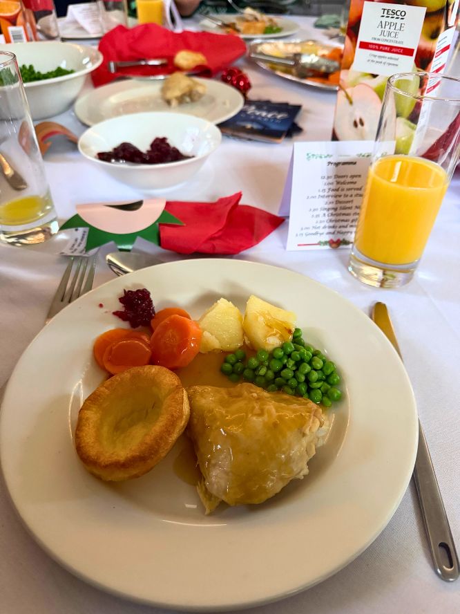 クリスマスの期間は、学内やそれ以外でもたくさんのイベントがありました。その中で、私は留学生向けに行われるクリスマスのランチ会に参加しました。地域の方々からサポートいただいているイベントのため、様々な方とお話しすることができました。イギリスでの伝統的なクリスマスの食事やスイーツをいただいたり、歌を歌ったり、とても充実したクリスマスになりました。食事前には、クリスマスクラッカーというものを鳴らして、中に入っているおもちゃを楽しむという習慣があるようで、留学に来なければ体験することが出来なかったと思います。