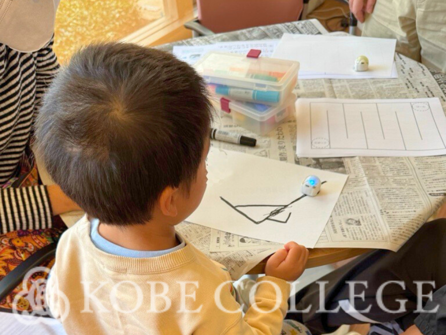 子どもたちは、赤・青・緑・黄のマーカーで自由に線を描き、その上を小さなロボット Ozobot(オゾボット) がライトの色を変えながら進む様子を観察し、「マーカーの色によって動きが変わる」仕組みに夢中になっていました。自分で考えた線をロボットが読み取り動く体験は、まさにプログラミングの入り口となり、子どもたちはとても楽しそうに取り組んでいました。