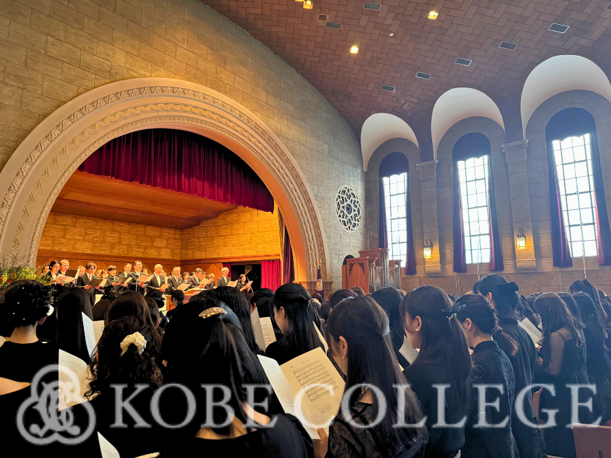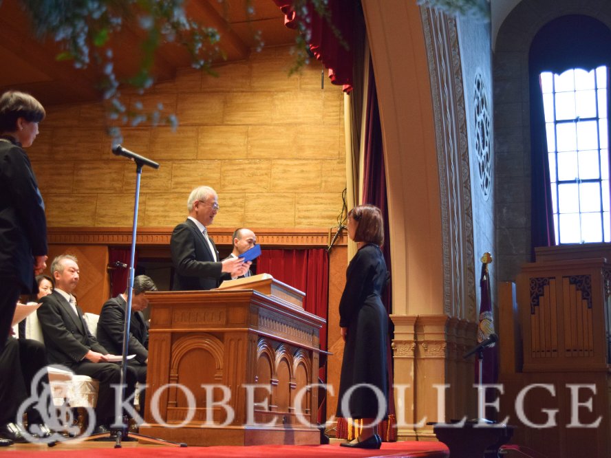 会場となったエミリー・ホワイト・スミス記念講堂では、讃美歌や記念歌「Beauty Becomes a College」などの美しい旋律が奏でられ、学長から各学科・研究科の代表学生に学位記が手渡されました。また、午前、午後ともに卒業生代表による、神戸女学院大学で過ごした学生生活に対する思いのこもった答辞が述べられました。