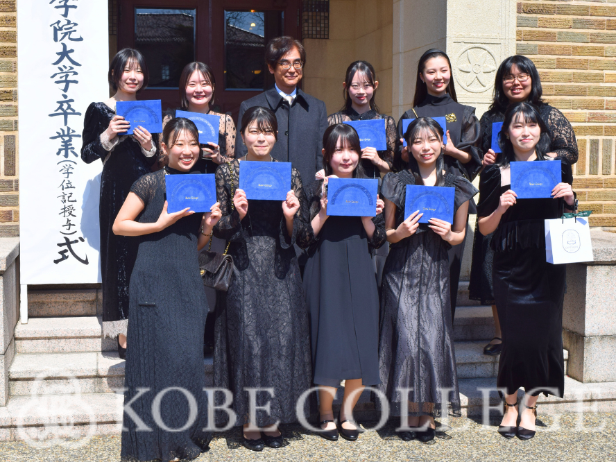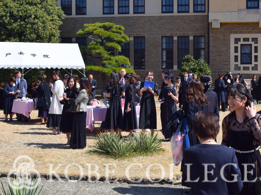 また、式典後には中庭において茶話会が開催されました。澄み渡るような青空のもと、卒業生は思い思いに記念撮影をしたり、神戸女学院大学で過ごした4年間の思い出話に花を咲かせたりと、かけがえのない時間を楽しみました。